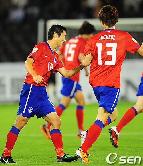 전반 선취골을 넣은 구자철이 이영표와 하이파이브를 하고 있다./rumi@osen.co.kr