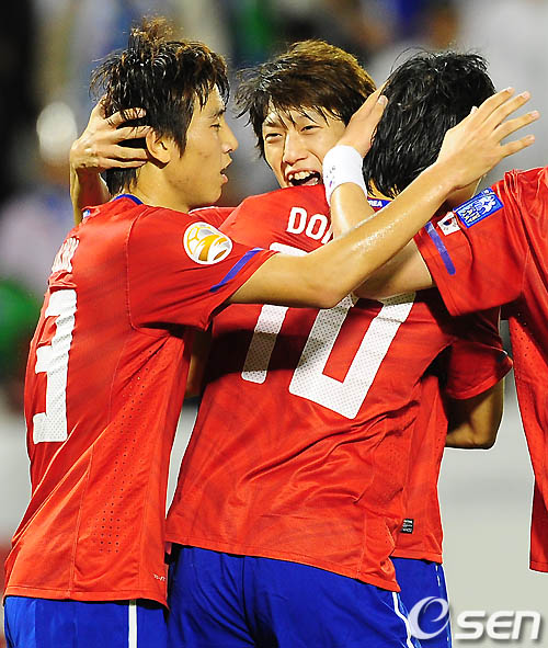전반 지동원이 두번째 골을 성공시켰을대 이청용이 지동원과 구자철을 포옹하고 있다./rumi@osen.co.kr