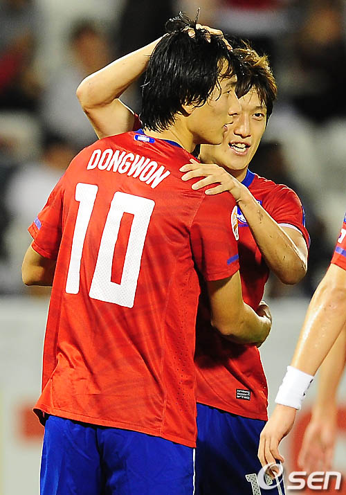 지동원이 한국 세번째 골을 성공시킨 후 이청용이 지동원의 머리를 쓰다듬고 있다./rumi@osen.co.kr