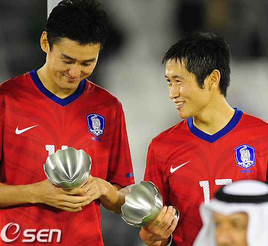 경기를 마치고 이영표가 3위 트로피를 들고 이정수와 즐겁게 얘기를 나누고 있다. /rumi@osen.co.kr