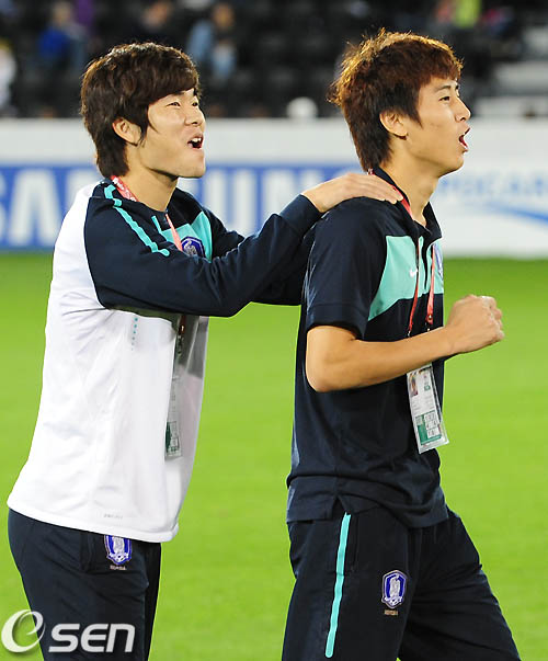 경기를 마치고 구자철과 유병수가 즐겁게 시상대로 향하고 있다. /rumi@osen.co.kr