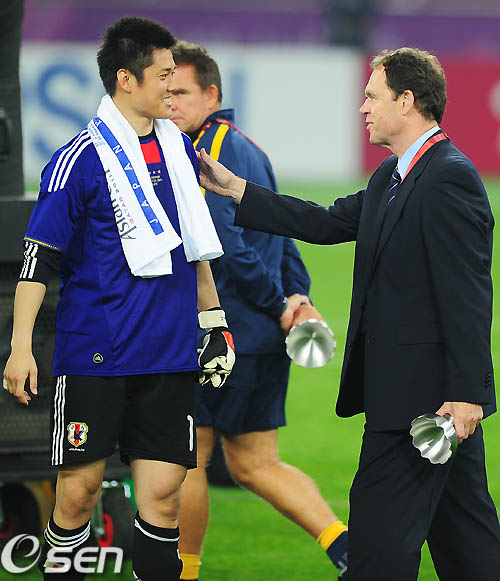 경기를 마치고 2위를 수상한 호주 홀거 오직 감독이 일본 가와시마 골키퍼와 얘기를 나누고 있다./rumi@osen.co.kr