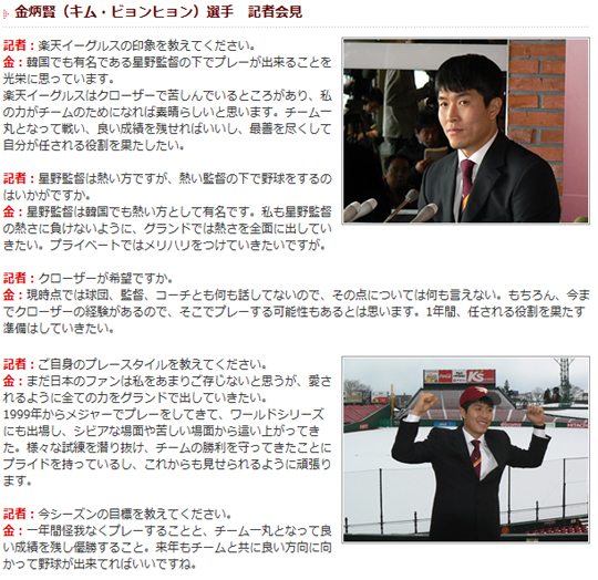 30일 일본 <데일리스포츠>는 오는 2월 1일부터 라쿠텐의 전훈지인 쿠메지마 캠프에 합류하는 김병현이 30일 K 스튜디오 미야기 구장에서 가진 입단 인터뷰에서 "내일부터 불펜에 대기해도 문제 없다"면서 만전을 강조했다고 보도했다.