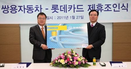 [이브닝신문/OSEN=정은진 기자] 쌍용자동차는 지난 27일 롯데카드 본사에서 하관봉 국내영업본부 부사장(사진 왼쪽) 및 박희수 롯데카드 부문장 등 양사 임직원이 참석한 가운데 롯데카드와 업무제휴협약 체결식을 가졌다.