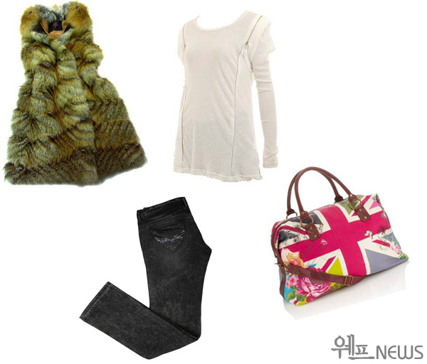 기본 화이트 티셔츠와 와일드한 퍼 베스트로 고소영의 공항패션처럼 스타일링해보면 어떨까. 어깨에 지퍼 포인트가 있는 ‘코인코즈’의 화이트 롱 티셔츠는 라인을 살려주고, 경쾌함을 살려주며, 블랙 워싱의 ‘GV2’팬츠는 엉덩이에 포켓 비즈로 포인트를 주었다.