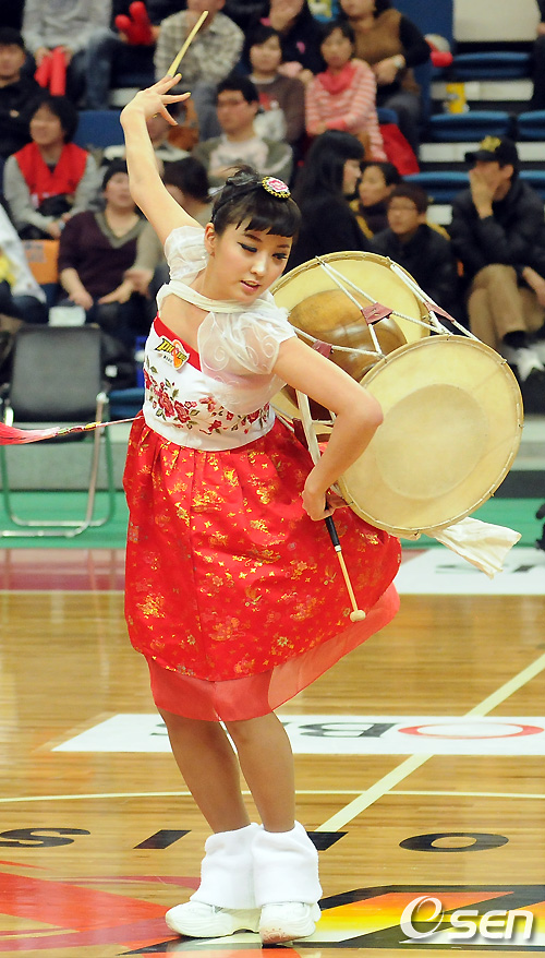 하프타임때 모비스 치어리더들이 한복을 입은채 화려한 무대를 펼치고 있다./soul1014@osen.co.kr