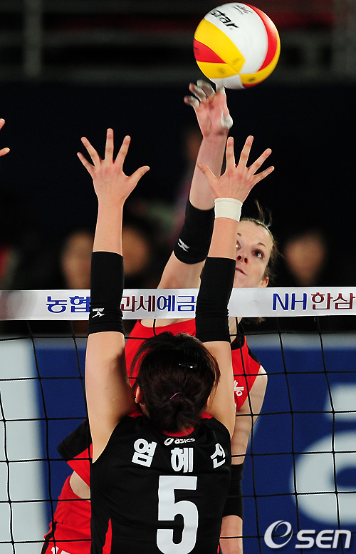 1세트 V-스타 미아가 엄혜선의 블로킹을 피해 강타를 날리고 있다. /sunday@osen.co.kr