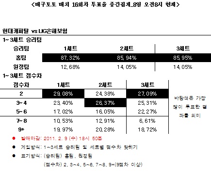 체육진흥투표권 수탁사업자인 스포츠토토 공식 온라인 발매사이트 베트맨(www.betman.co.kr)이 오는 9일(수) 오후 7시 천안 유관순체육관에서 열리는 현대캐피탈-LIG손해보험전 대상 배구토토 매치 16회차 게임 투표율을 중간집계한 결과, 국내 배구팬들은 현대캐피탈이 LIG손해보험을 상대로 압도적인 승리를 거둘 것으로 내다봤다.