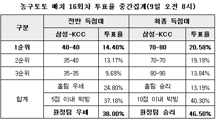 2010-2011시즌 농구토토 매치 16회차 투표율 중간집계 결과. 최종 득점대 70-80 KCC 승리 20.58%…10일 오후 6시 50분 발매 마감