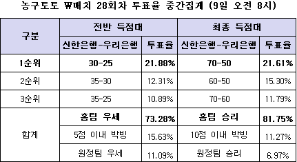 2010-2011 시즌 농구토토 W매치 28회차 투표율 중간집계 결과. 전반전 신한은행 우세 73.28%…최종 득점대 70-50점대 신한은행 승리 21.61%