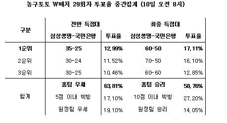 양 팀의 10점 이내 박빙승부를 예상한 참가자는 27.20%로 집계됐고, 나머지 14.05%는 원정팀 국민은행의 승리를 예상했다.