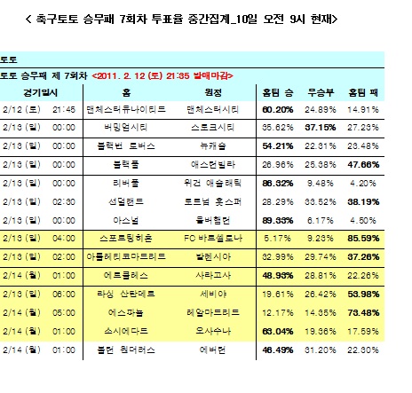 축구토토 승무패 7회차 게임은 오는 12일(토) 오후 9시 35분에 발매가 마감된다.