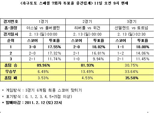 [축구토토] 국민체육진흥공단(www.kspo.or.kr)이 발행하는 스포츠토토 공식 온라인 발매 사이트인 베트맨(www.betman.co.kr)은 오는 13일(일) 펼쳐지는 아스널-울버햄턴(1경기), 리버풀-위건애슬래틱(2경기), 선덜랜드-토트넘(3경기)전 등 영국 프리미어리그 3경기를 대상으로 한 축구토토 스페셜 7회차 투표율 중간집계 결과, 축구팬 81.93%는 2경기 리버풀-위건전에서 홈팀 리버풀의 압도적인 승리를 예상했다고 밝혔다.