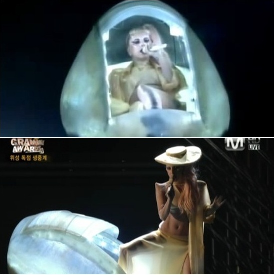또 이날 퍼포먼스의 제왕 가가는 일명 '거대한 알 퍼포먼스'를 펼쳐 시선을 사로잡았다. 이번 시상식에서 지난 주말 발표한 신곡 'Born This Way'를 처음으로 선보인 가가는 노란 시스루 의상을 입고 누에고치에서 나오는 파격 퍼포먼스, 여기에 뛰어난 라이브 실력을 뽐내 무대를 달궜다.