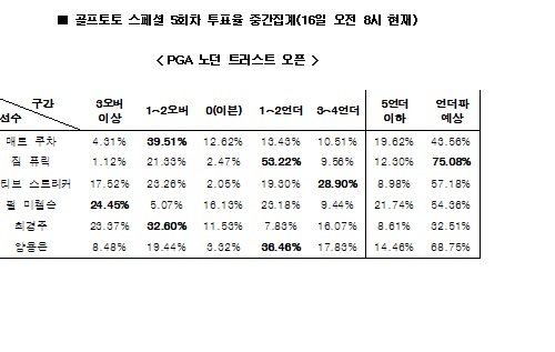 국민체육진흥공단(www.kspo.or.kr)이 발행하는 체육진흥투표권 수탁사업자인 스포츠토토(www.sportstoto.co.kr)는 오는 17일(목)부터 미국 캘리포니아에서 개최되는 PGA 노던 트러스트 오픈 1라운드를 대상으로 하는 골프토토 스페셜 5회차에서 전체 참가자의 75.08%가 짐 퓨릭의 언더파 활약을 예상했다고 밝혔다.
