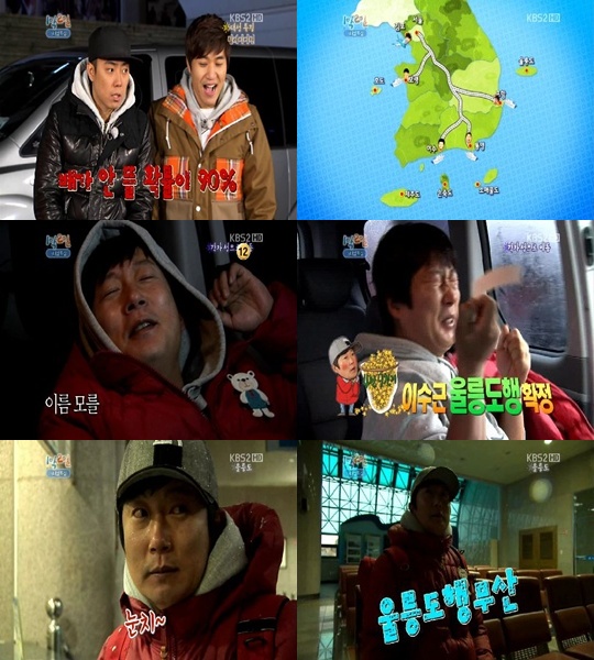 이날 날씨가 매우 좋지 않아 돌아오는 날 배가 뜨지 않을 확률이 90%였다. 배가 뜨지 않으면 ‘1박2일’ 촬영과 상관없이 울릉도에 계속 머물러야만 했다.
