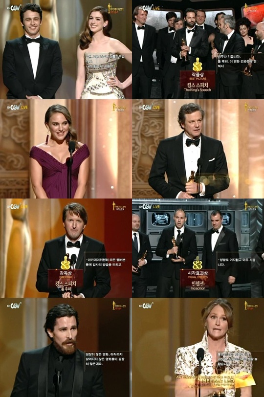 당초 아카데미 시상식을 앞두고 ‘킹스 스피치’와 ‘소셜 네트워크’가 각축을 벌일 것으로 예상됐지만, 오스카는 작품상을 비롯 감독상, 남우주연상, 각본상까지 4개의 트로피를 ‘킹스 스피치’에게 안겼다.