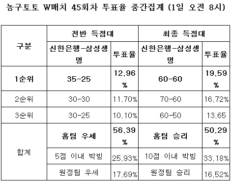 국민체육진흥공단(www.kspo.or.kr)이 발행하는 체육진흥투표권 수탁사업자인 스포츠토토의 공식 온라인 발매사이트인 베트맨(www.betman.co.kr)은 오는 2일 오후 5시 안산 와동실내체육관에서 열리는 2010-2011 여자프로농구 신한은행-삼성생명전을 대상으로 한 농구토토 W매치 45회차 투표율 중간집계 결과, 전체 참가자의 50.29%는 신한은행이 삼성생명을 상대로 근소한 우세를 보일 것으로 전망했다고 밝혔다.