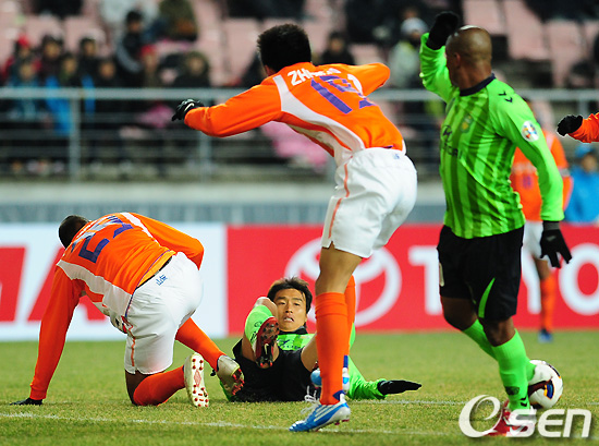 전반 전북 이동국이 산둥 리카르도에게 반칙을 당하고 있다. /sunday@osen.co.kr