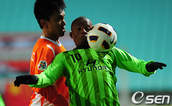 전반 전북 루이스가 산둥 장츠를 등지고 가슴으로 공을 확보하고 있다. /sunday@osen.co.kr