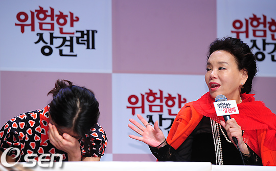 기자회견중 김수미의 말에 이시영이 환하게 웃고 있다./rumi@osen.co.kr