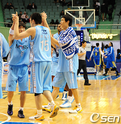 경기 종료 후 모비스 선수들이 승리의 기쁨을 나누고 있다. /sunday@osen.co.kr
