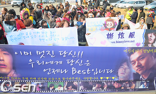 현빈은 7일 오후 경북 포항시 오천읍 세계리에 위치한 해병 교육 훈련소에 입소할 예정인 가운데 아침부터 수많은 현빈 팬들이 아침부터 해병 교육 훈련소 앞에서 그를 기다리고 있다.