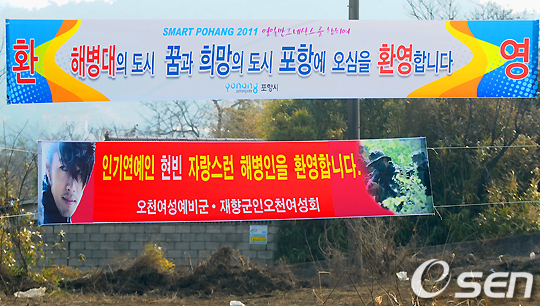 현빈은 7일 오후 경북 포항시 오천읍 세계리에 위치한 해병 교육 훈련소에 입소할 예정인 가운데 환영 플랜카드가 부대 근처에 걸려있다.