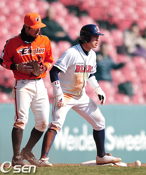 17일 오후 서울 잠실구장에서 열린 2011 프로야구 두산 베어스와 한화 이글스의 시범경기 7회말 무사 1,2루 두산 김재환의 1타점 적시타때 한화 한상훈이 공을 놓친 사이 1루 주자 정수빈이 세이프 됐다. 한상훈은 글러브를 의아해 하며 쳐다보며 공을 찾고 있다./soul1014@osen.co.kr