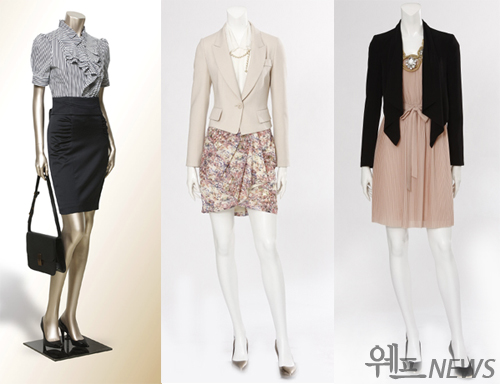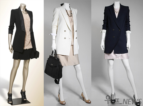 또한 같은 디자인이지만 다른 컬러의 네이비 테일러드 재킷은 매니시하고, 선명한 컬러에서 확실한 인상을 심어준다. 재킷 컬러와 명도차이가 큰 핑크 톤 원피스로 예식장에 어울리는 스타일을 제시한다.