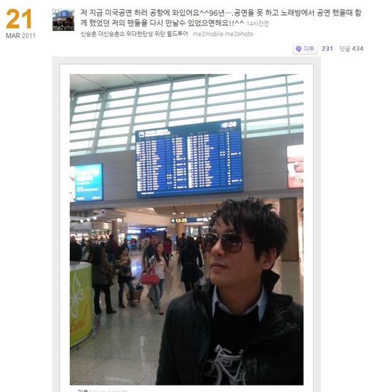 그는 이날 미투데이에 "저 지금 미국 공연하러 인천공항에 와 있어요. 96년 공연을 못 하고 노래방에서 공연 했을 때 함께 했었던 저의 팬들을 다시 만날 수 있었으면 해요"라고 메시지를 남겼다.