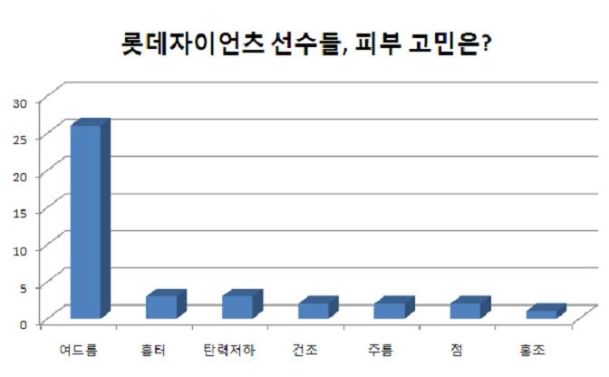8개 구단 최고의 공격력을 과시 중인 롯데자이언츠 선수단이 피부와 관련해 여드름으로 가장 많이 고민하는 것으로 나타났다.