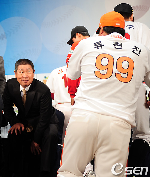 행사를 마치고 포토타임때 SK 김성근 감독이 장난치며 올라오는 두산 김현수와 한화 류현진을 쳐다보고 있다./soul1014@osen.co.kr