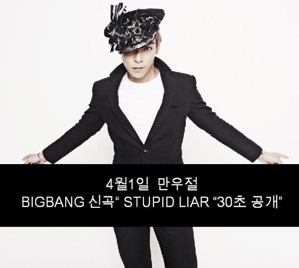 29일 YG 고식 블로그에는 '4월 1일 만우절 신곡 'STUPID LIAR' 30초 공개'라는 글이 게재됐다. 글과 함께 올려진 사진에는 독특한 모자를 쓰고 한 쪽 눈을 가린 시크한 분위기의 멤버 탑이 강렬한 눈빛을 취하고 있다.