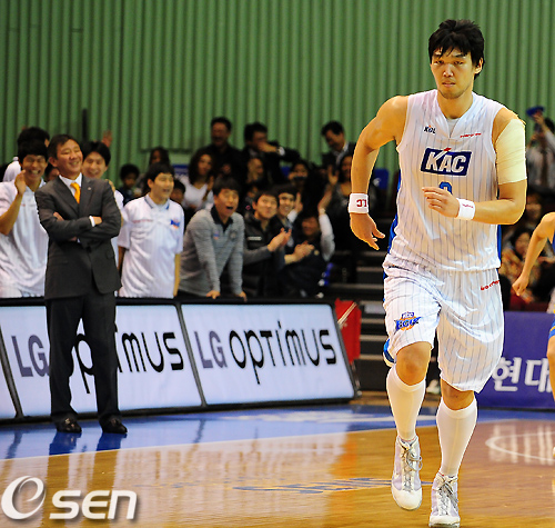 4쿼터 종료가 얼마 남지 않은 상황에서 KCC 하승진이 3점슛을 성공시키자 허재 감독이 돌어서 뛰어가는 하승진을 바라보며 웃고 있다./rumi@osen.co.kr