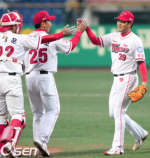 KIA가 3일 광주구장에서 열린 2011 롯데카드 프로야구 삼성과의 경기에서 김상현의 만루포, 이범호의 결승 솔로포와 양현종을 포함해 투수 6명을 쏟아붓는 총력전을 벌인 끝에 9-8로 진땀승을 거두었다. 전날 패배를 설욕하고 1승1패를 기록했다.