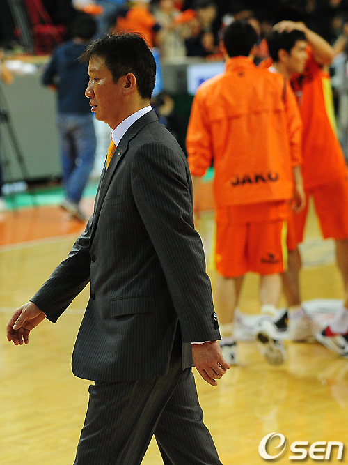 경기를 마치고 KCC 허재 감독이 승리를 기뻐하는 전자랜드 선수들을 뒤로하고 퇴장하고 있다./rumi@osen.co.kr