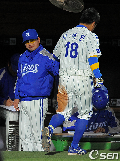 [OSEN=대구,지형준기자] 6일 오후 대구구장에서 열린 '2011 롯데카드 프로야구' 삼성 라이온즈와 롯데 자이언츠의 경기, 2회말 1사 2루에서 삼성 가코의 선제 1타점 중전 적시타에 홈을 밟은 박석민이 류중일 감독과 하이파이브를 하고 있다. /jpnews@osen.co.kr
