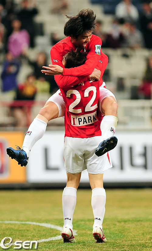 후반 부산 한지호의 선취골때 양동현이 축하해주고 있다 ./soul1014@osen.co.kr