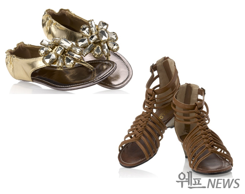 블링크의 ‘801218B’는 골드 메탈릭 칼라에 큼지막한 큐빅 장식이 화려함을 더해주며, 누오보의 ‘T-CODE BS 4.5’는 브라운 컬러의 가죽 꼬임 디테일이 세련되고 시원해 보이는 웨지 스타일로 발에 전해지는 부담감을 줄여줄 뿐 아니라 샌들 뒷부분에 지퍼가 있어 신고 벗기 편리하다.