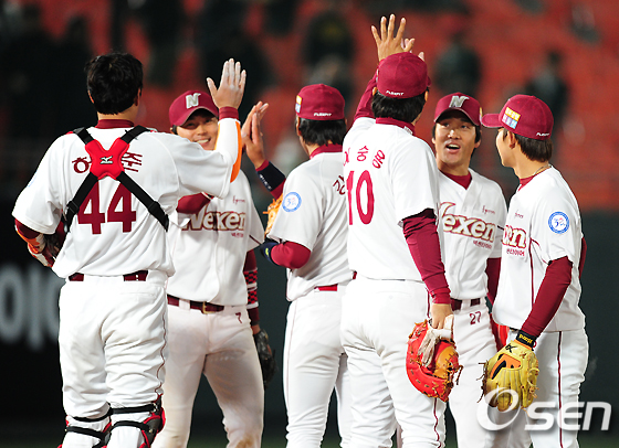 8일 오후 목동야구장에서 열린 '2011 롯데카드 프로야구' 넥센 히어로즈와 롯데 자이언츠 경기에서 넥센 히어로주가 선발 나이트의 7⅔이닝 무실점 호투와 김민우,유한준의 타선에 힘입어 3-0 승리를 거두었다. 경기 종료후 선수들이 승리의 기쁨을 나누고 있다. / ajyoung@osen.co.kr
