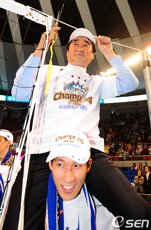 삼성화재 신치용 감독이 배구 네트를 자르며 우승을 기뻐하고 있다. /jpnews@osen.co.kr