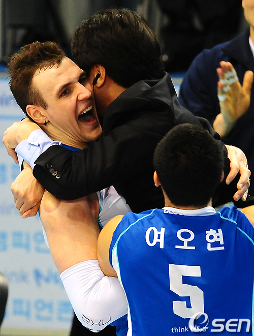 삼성화재 신치용 감독과 가빈이 우승이 확정되자 포옹을 하며 기뻐하고 있다. /jpnews@osen.co.kr