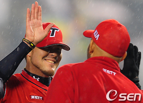 KIA 트레비스가 완봉승을 거두고 로페즈와 하이파이브를 하고 있다. /jpnews@osen.co.kr