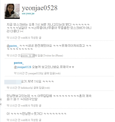 손연재도 "'런닝맨' 보고 있는데, 아우 답답해. 혼자 계속 쏴! 쏴! 이러고 있다. 완전 재밌다. 유재석 아저씨 최고"라는 글을 자신의 트위터에 올렸다.