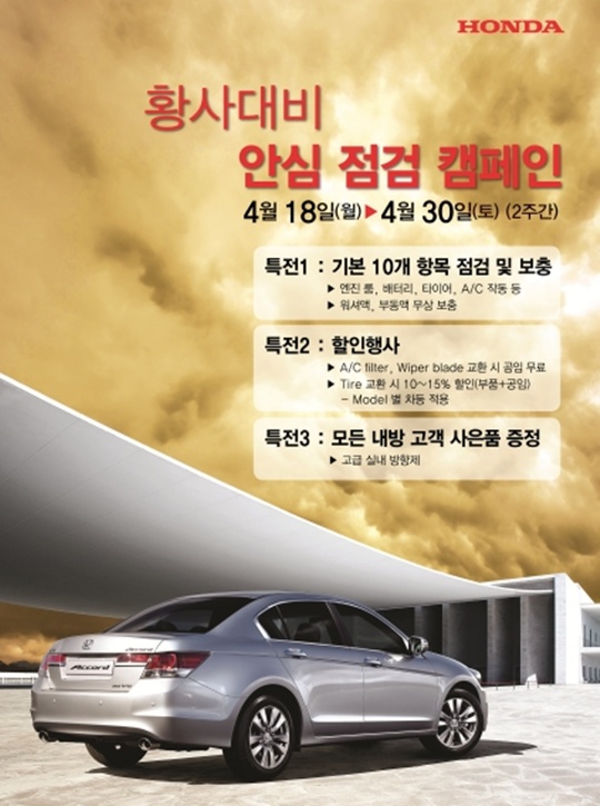 이번 ‘황사대비 안심 점검 캠페인’은 4월 18일부터 2주 간 혼다코리아의 공식 서비스센터 및 협력점에 서 진행되며, 내방하는 모든 고객에게 사은품으로 고급 실내 방향제를 증정한다.