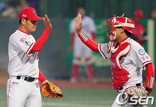 경기 종료 후 KIA 유동훈과 김상훈이 하이파이브를 하고 있다. /sunday@osen.co.kr