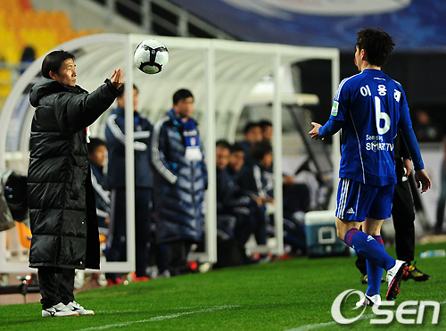 전반 강원 김상호 감독이 수원 이용래에 볼을 건네고 있다. /jpnews@osen.co.kr