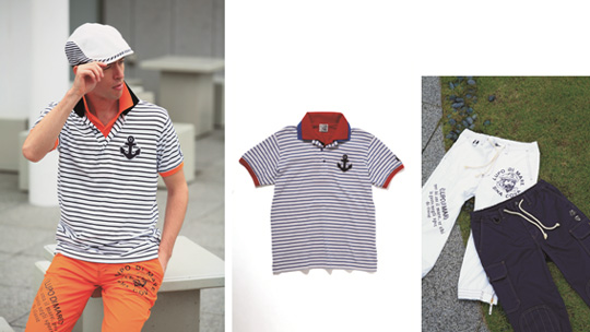 강렬한 레드 블루의 이중칼라가 특징인 시나코바의 피케셔츠는 블루 스트라이프와 닻모양 왓펜이 마린룩을 한껏 살려준다. 여기에 같은톤의 스트라이프 플랫 캡(flat cap)을 코디해 주는 센스를 발휘하면 좋겠다.