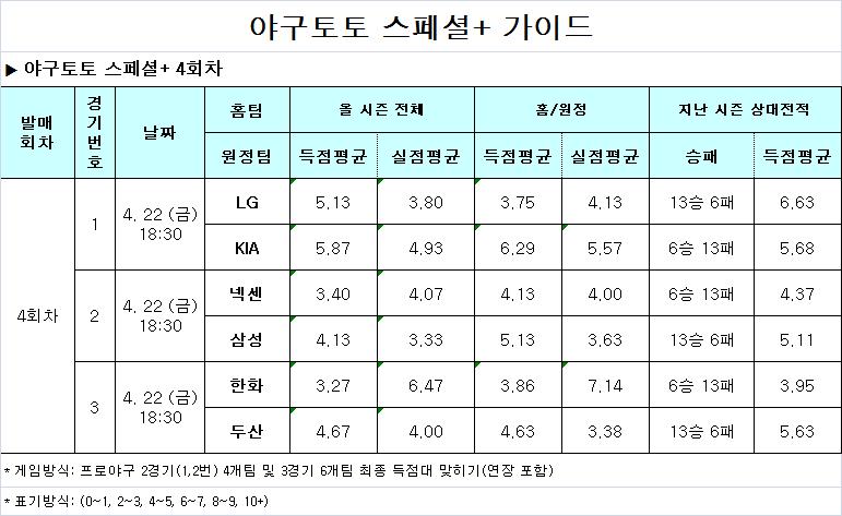 이번 야구토토 스페셜+ 4회차 게임은 22일 오후 6시 20분에 발매가 마감된다.
